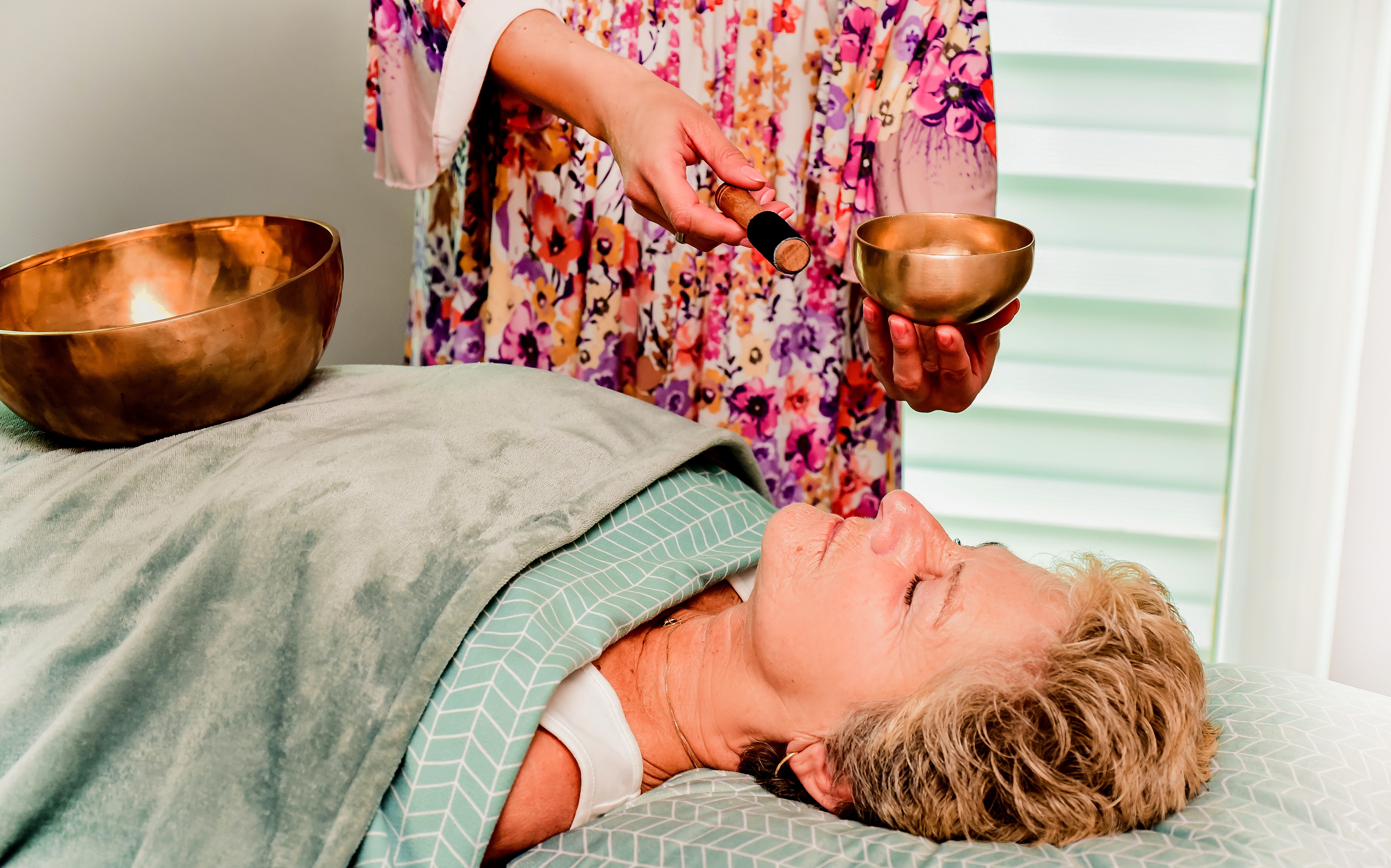 Bei der Klangschalenmassage wird ohne Öl gearbeitet. Sie liegen in möglichst bequemer Kleidung und in einem angenehm temperierten Raum auf der Liege oder einer gut gepolsterten Matte, während ich mit Hilfe von unterschiedlich großen Klangschalen versuche, Blockaden zu erhören und zu lösen. Da der menschliche Körper zu einem großen Teil aus Wasser besteht, wird durch die Klangwellen der Schalen, die Flüssigkeit in unserem Körper zum Schwingen gebracht.